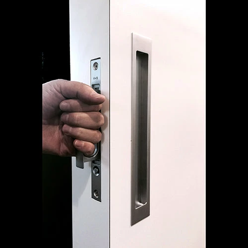 Its slim face plate, oversized hand grip and smooth push button release make it ideal for large scale sliding wood passage doors.