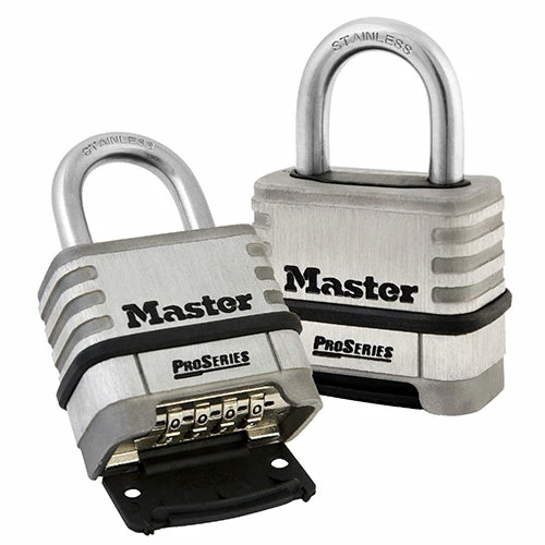 The Master Lock No. 1174 ProSeriesยฎ Resettable Combination Padlock is designed for commercial/industrial applications and features a 2-1/4in (57mm) wide stainless steel body and a 1-1/16in (28mm) tall, 5/16in (8mm) diameter stainless steel shackle for extreme corrosion resistance. A set-your-own combination feature offers convenience and security with 10,000 possible combinations โ no reset tool required โ and a deadlocking mechanism protects against prying, shimming and rap attacks.