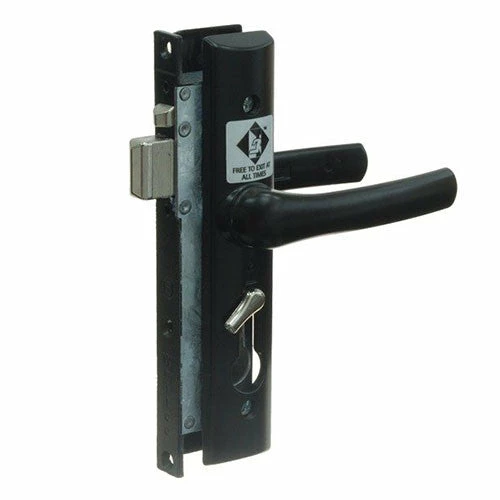 Emergency escape hinged security or screen door lock, free to exit at all times.